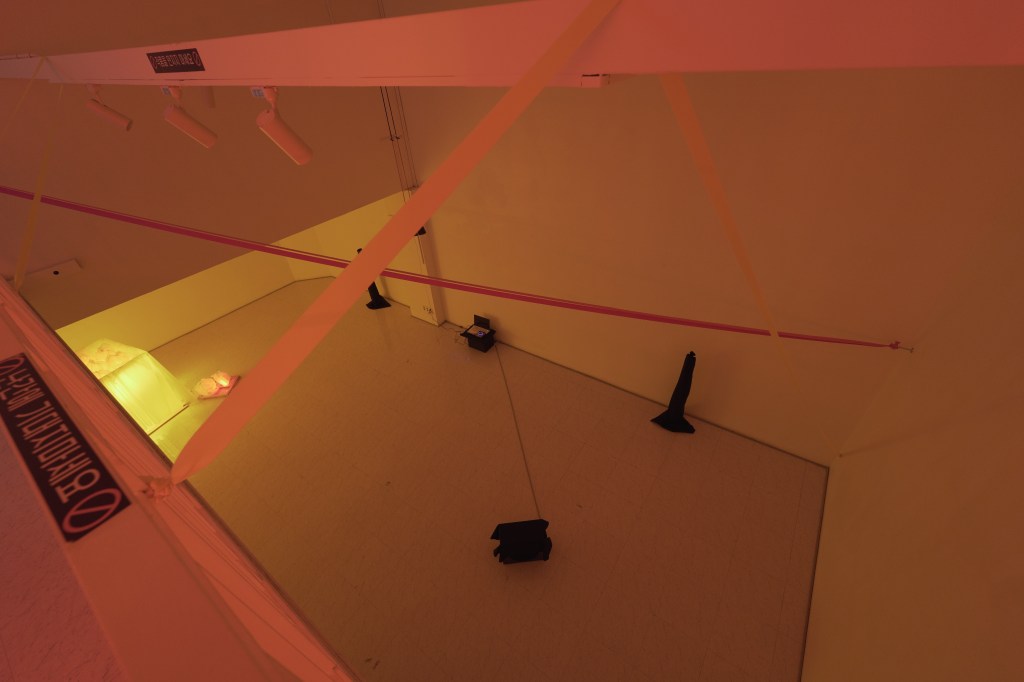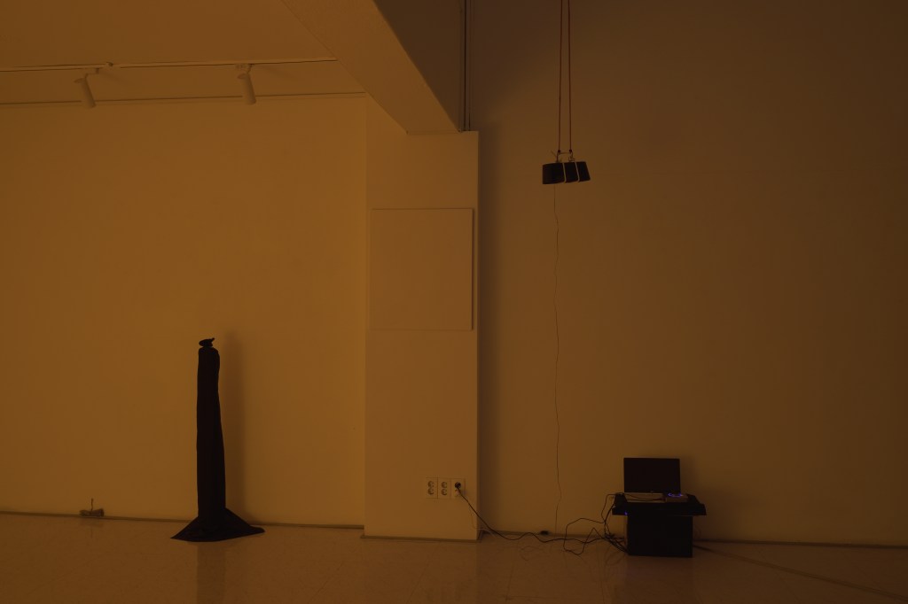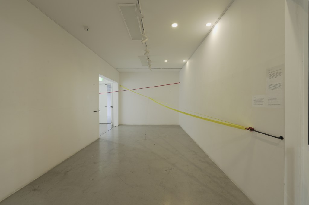 : 인지 작용에 대한 논제로 시작하여 매개체를 통해 유도되는 우리의 공간 개입이라는 점을 큰 틀로 삼아 보았을 때, 1층에 전시된 탄성 밴드의 물성, 색깔, 그리고 그 방향까지도 (의도 했든 의도치 않았든) 우리의 공간 개입을 유도하게 됩니다. 그리고 거기에서 우리가 자연스럽게 따라가게 되는 동선을 따라 다른 작품들로 우리의 접촉이 이어지게 되죠. 지하로 들어가는 검은 커튼을 통과하게 되었을 때, 아니 이미 그 긴 검은 물체에 가까이 다가가는 순간부터 우리는 서서히 청각이라는 다른 감각 자극에 노출되기 시작합니다. 전시장에 들어서기 이전과 전시장 1층, 그리고 전시장의 지하 1층 공간은 완벽히 분리되지 않았습니다. 하지만 그 다른 세 곳(혹은 연결된 한 곳,)의 공간을 통과하면서 우리는 인식하지 못할 정도로 자연스럽게 공간의 분리를 느끼게 됩니다. 여기에는 어떤 물리적인 장벽이라할 것을 딱히 찾아보기 힘듦에도 말이죠.